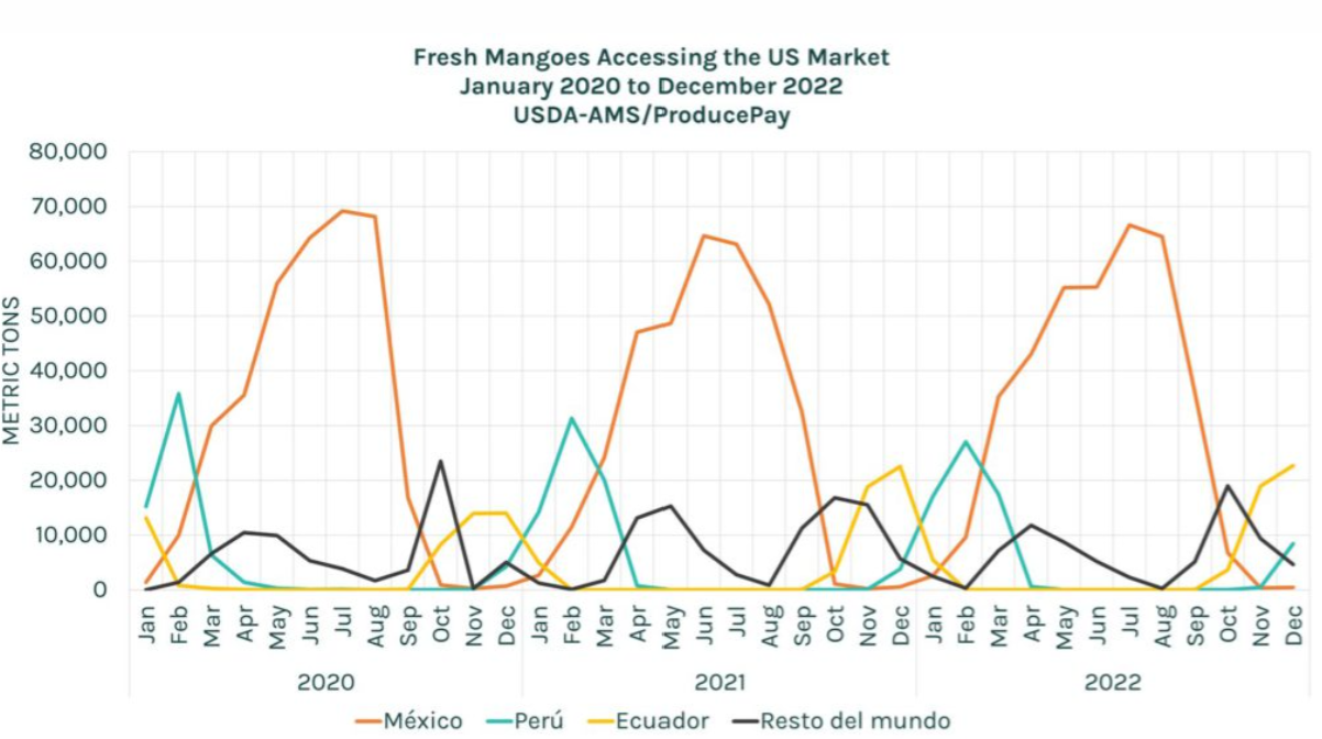 The United States imports mangoes primarily from Mexico, Peru, and Ecuador. While Mexico is the leading exporter overall, Peru dominates the market from November to April (Peru's summer months). On average, the U.S. imports 165,000 metric tons of mangoes annually from Peru. In the 2023-24 season, this number plummeted to 47,000 metric tons! The cause was a super strong El Niño that elevated temperatures during the mango flowering season, resulting in harvest reductions of up to 90% in some cases. This scarcity led to a significant spike in mango prices.